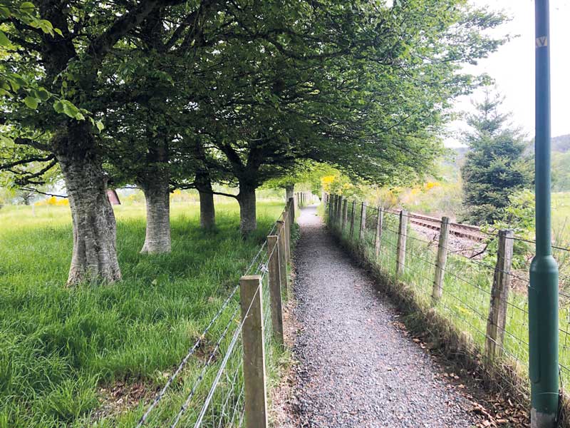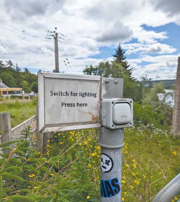 There are light switches on both sides, providing illumination at night. (Centre) A plaque in memory of Sandy Chalmers was erected in 2018. (Right) The path as it approaches Culrain station. Photos © Katrin Lopes-Carrie
