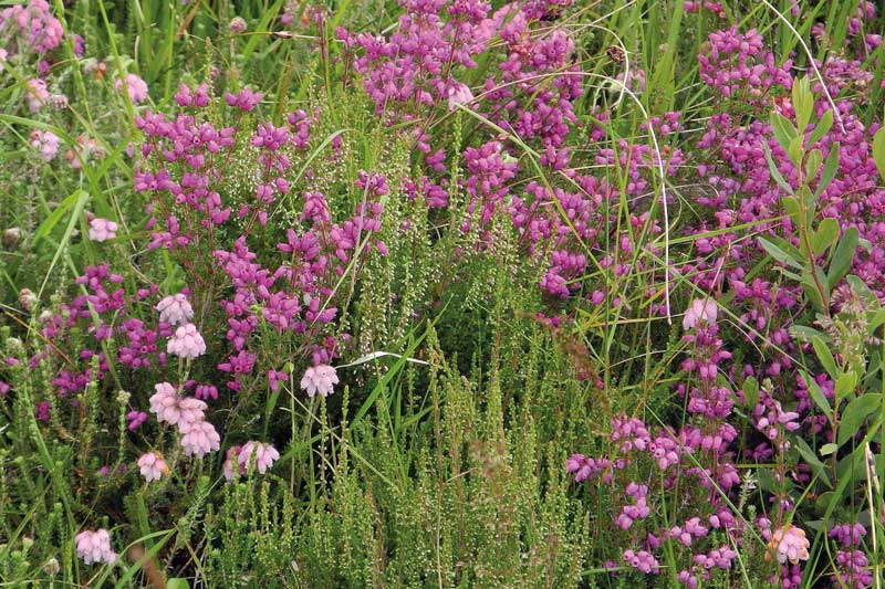 (Left) Pale pink cross leaved heath, bright magenta bell heather and the buds on ling heather. (Centre) Muirburn. (Right) Ling heather under a Scots Pine.© B & C Alexander / Arcticphoto