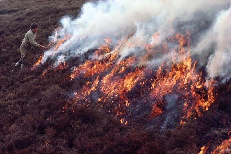 Muirburn is the practice of burning a patchwork of heather on moorland, so Moor Burn. It is done to encourage the shorter stems of the newly burnt plant to produce new shoots at a height that grouse chicks can reach and to make a variety of heather heights to give varied habitat and offer protection from predators to grouse chicks and other birds in the longer heather. The legislation on this changed in March this year and in Scotland can now only be done under license on designated peatlands and the date it must finish on has been brought forward by 2 weeks to the end of March, to protect ground nesting birds.