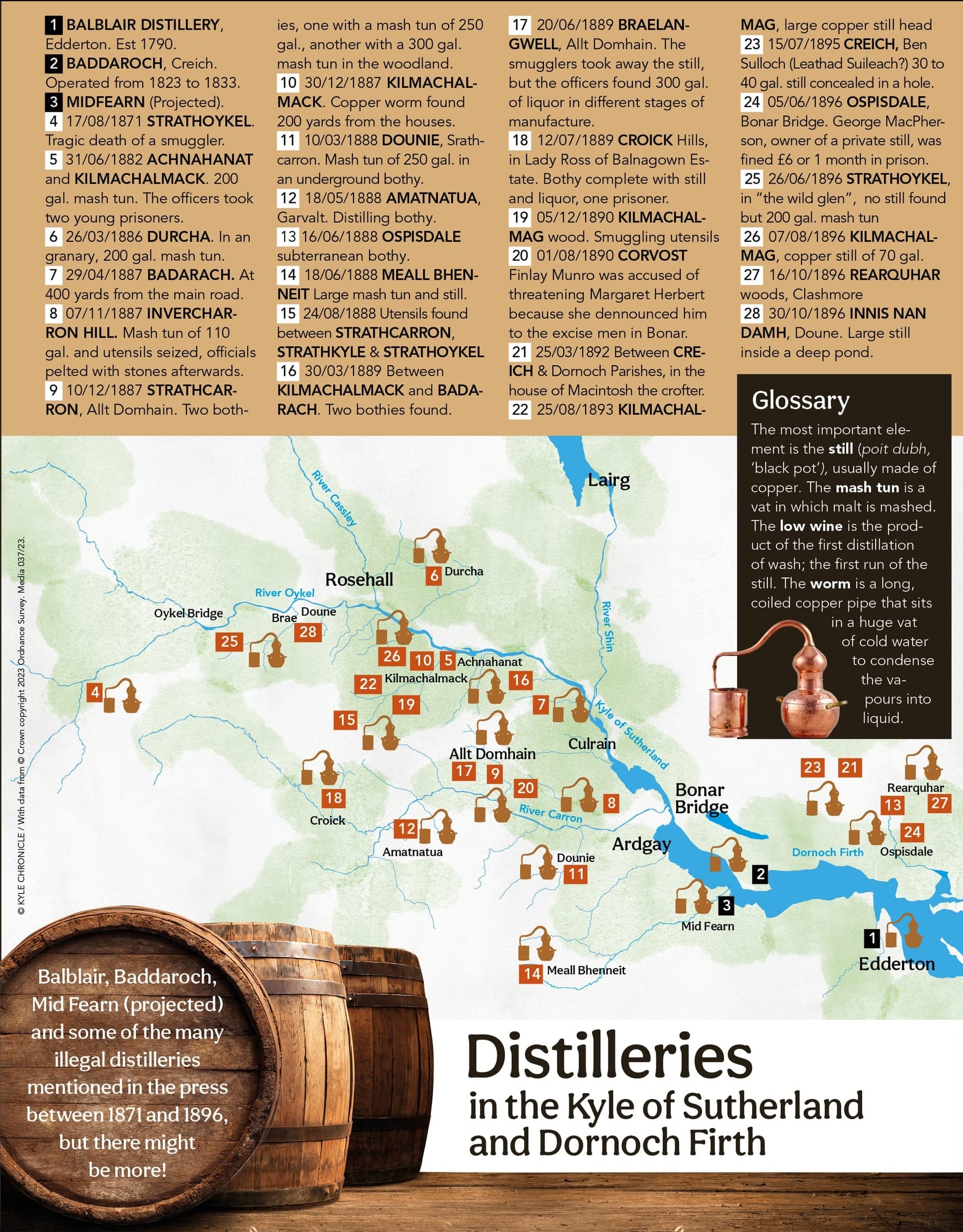 Sometimes the locations mentioned by the press are vague, for example, they found utensils (mash tun) “in that mountain range which separates Strathcarron from Strathkyle and Strathoykel” (Ross-shire Journal 24/08/1888), and a large copper still of about 70 gallons capacity in the “wild glen” of Strathoykel (Ross-shire Journal 07/08/1896).