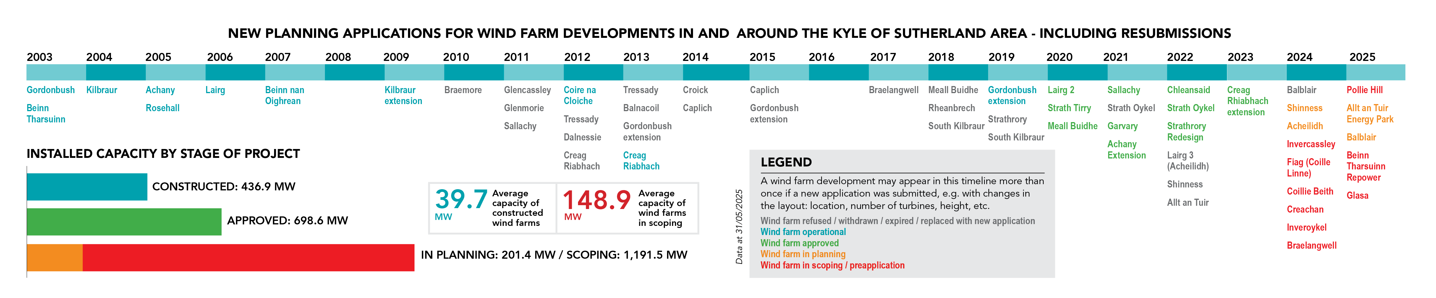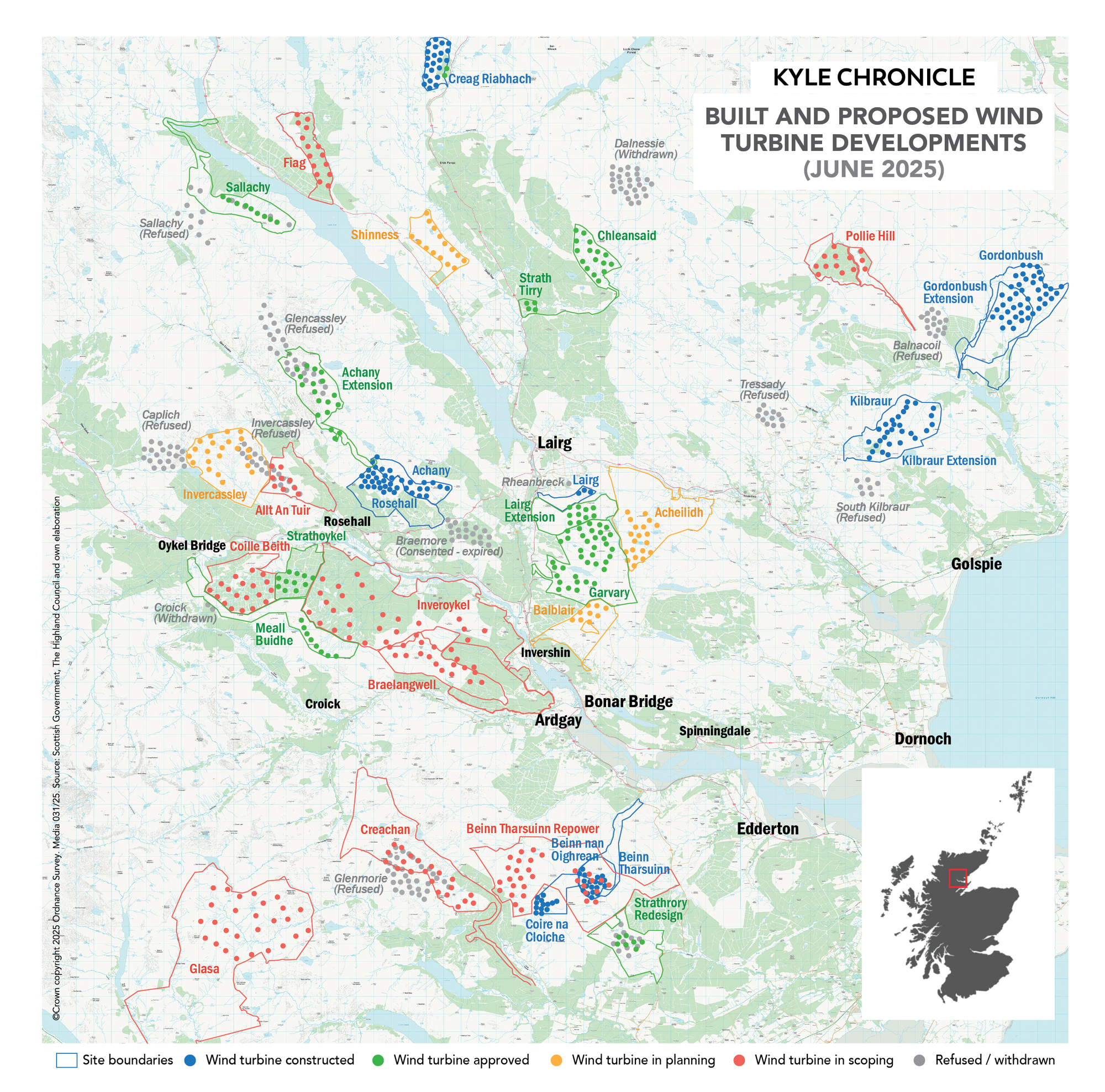 The Kyle of Sutherland and surrounding area have been attracting renewable energy generation developers since the early 2000s, with the first planning applications received in 2003. Over two decades later, there are 11 operating wind farms, 10 projects that have been granted planning permission, and another 13 wind farm development projects in planning or scoping.