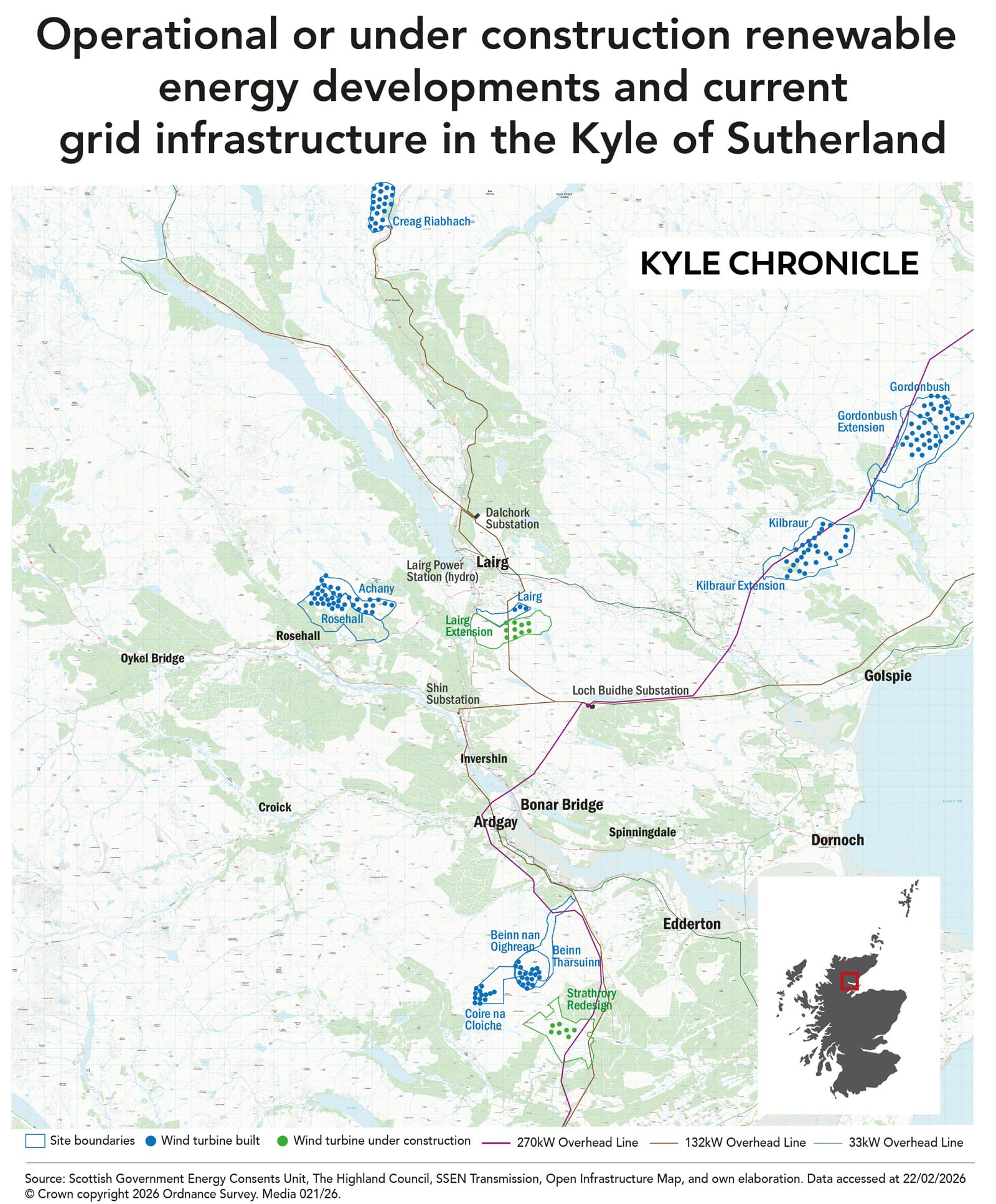 In June 2025 Kyle Chronicle mapped all the wind farm developments either built, approved, and in planning or scoping for the Kyle of Sutherland and surrounding area. The resultant map highlighted how communities in central and south Sutherland and Easter Ross have been overwhelmed in recent years by what feels like a relentless flow of wind farm applications, appeals and reapplications, and by a planning process that seems designed to bypass local democracy.