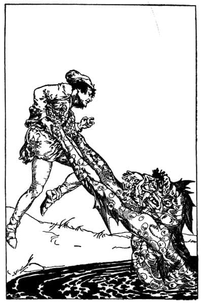J. F. Cambell recorded variants of this story from the islands: “Sometimes it is a Brollachan son of the Fuath, or a young water horse transformed into a man, which attacks a lonely woman, and gets burned or scalded, and goes away to his friends outside. In the islands, the woman generally says her name is Myself; and the goblin answers, when asked who burned him, “Myself.””