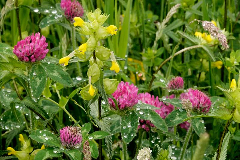 (Left) Flowers in the planted wildflower meadow at home. (Right) Drifts of daisies and hawkbit, with an underlayer of birdsfoot trefoil, yellow rattle and ribwort plantain, bees delight. © B&C Alexander / Arcticphoto